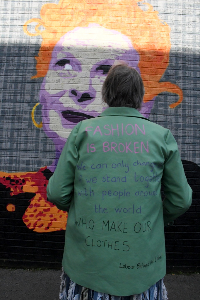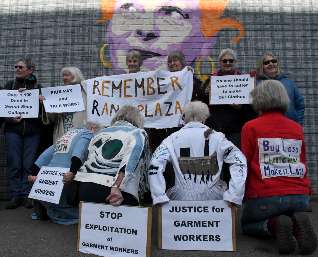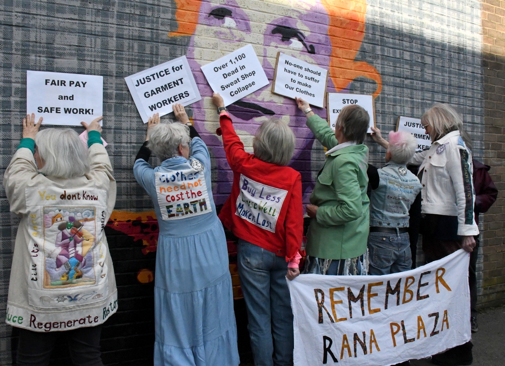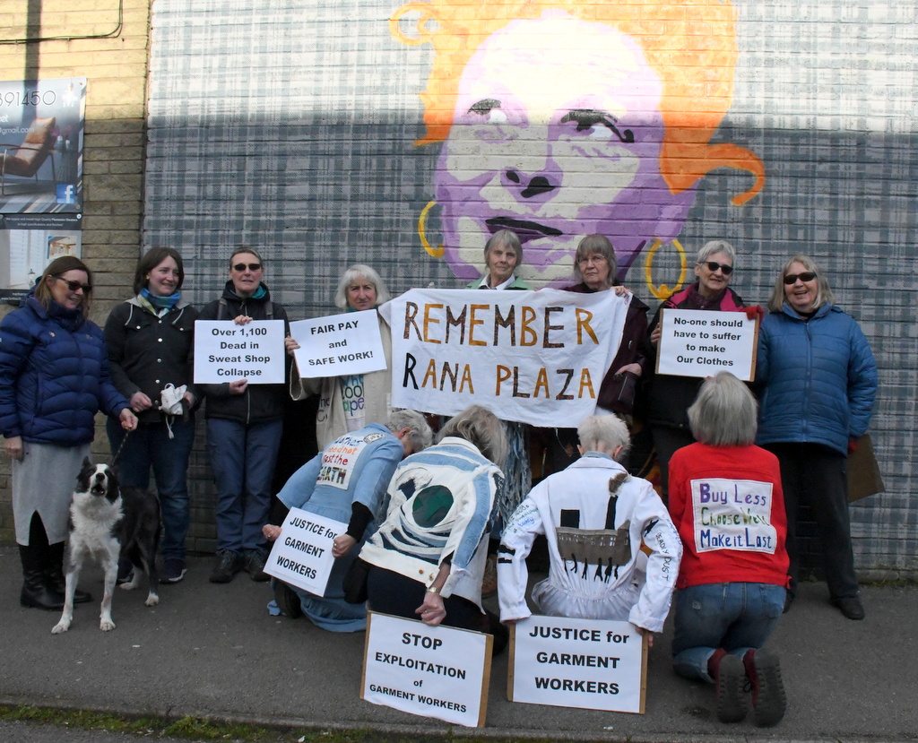 The New Mills Fashionistas gathered to mark the anniversary of Rana Plaza at the Vivienne Westwood mural in Glossop, where Westwood went to school.
