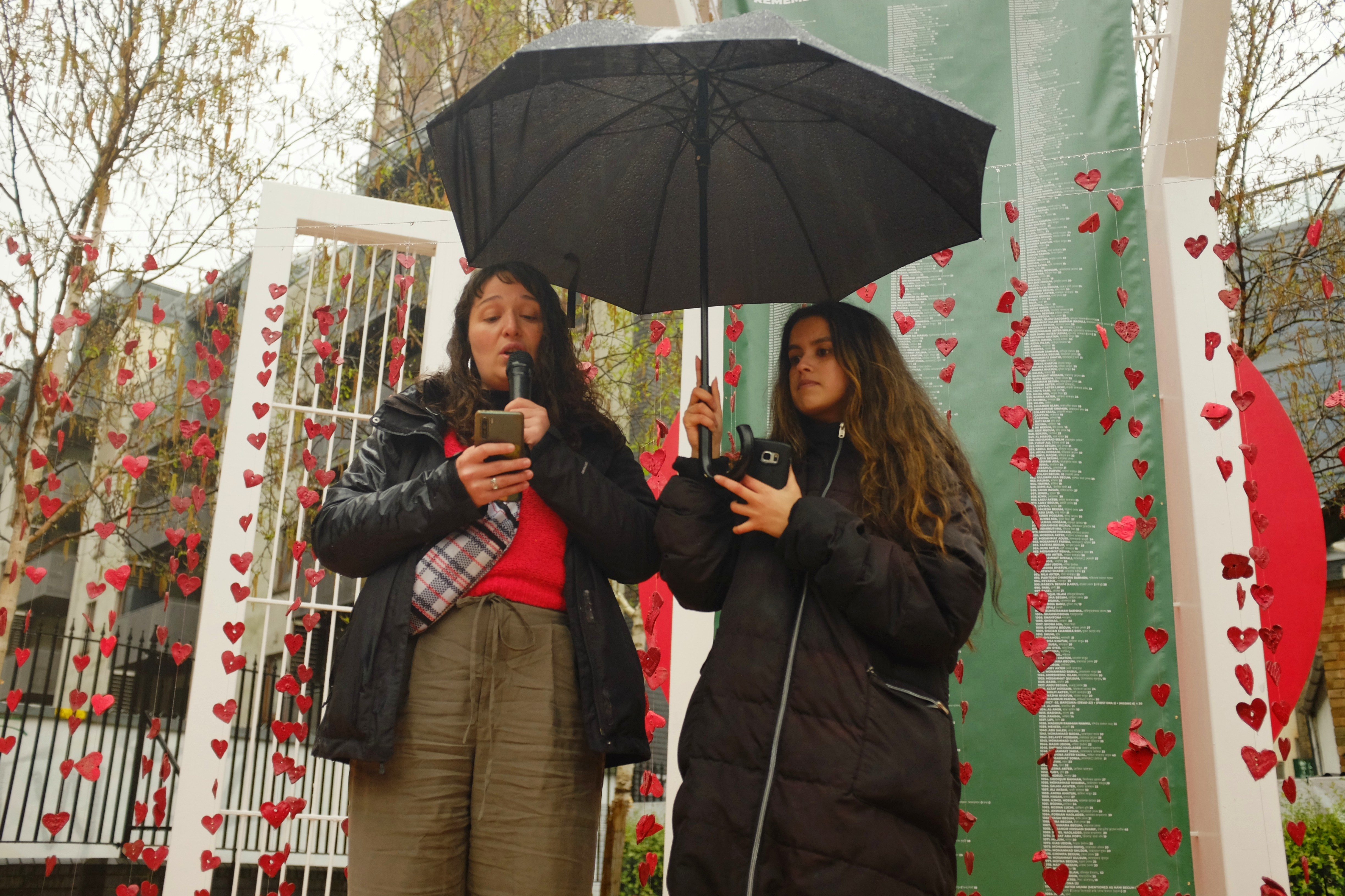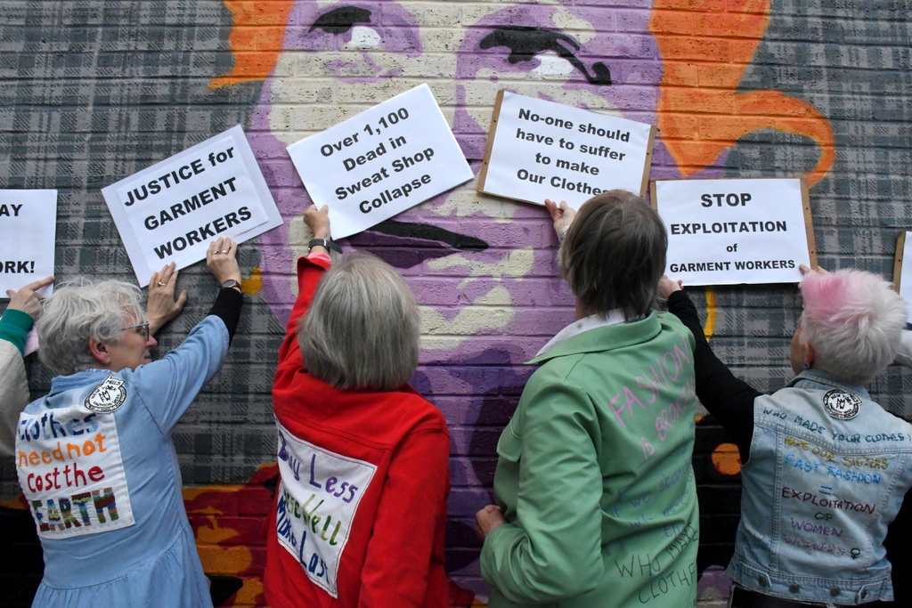The New Mills Fashionistas gathered to mark the anniversary of Rana Plaza at the Vivienne Westwood mural in Glossop, where Westwood went to school.